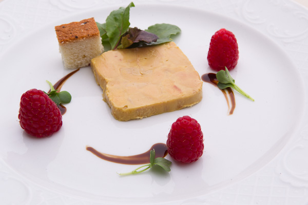 A borhoz felszolgált előétel: Préselt hízott kacsamáj, gurulós málnával és salátákkal. A hízott máj, légyen az kacsa, vagy liba, nem először szerepel a díszvacsorák és ebédek hosszú sorában. Elegáns étel, s hazánk hagyományosan kiemelkedő minőséget képes ebből a nyer5sanyagból előállítani. A préselt libamáj készítéséhez a máj ereit gondosan eltávolították, majd ezeket a részeket szőrszitán áttörték. Az áttört finom májpépet a májdarabokkal összekeverték, s 1000g májhoz 5g sót, és 5g barnacukrot, valamint 20ml Tokaji (édes) bort adtak. A májat ezután vákuum zacskóba tették, s 63,5%C hőmérsékleten 1 percig hőkezelték, ügyelve, hogy a máj ne lehessen „ikrás”. Ezt követően formázták, préselték, hűtötték, s legvégül szeletelték. Gurulós málnával és salátákkal (tölgy, rukkola, madár), kaláccsal, s frissen sült péksüteménnyel tálalták.