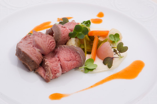 A bárányfartő a bárány ízletes húsrésze. 65°C hőmérsékleten 22 percig készült vákuum alatt (sous-vide), majd tálalás előtt, sütőben 250°C hőmérsékleten kérgesítették (regenerálták). Fűszere a só volt, s nem más, így a hús remek íze a mega teljességében bontakozhatott ki. A zsenge tavaszi zöldségek lényegében egy korszerű „főzeléket” takarnak. Cukorborsó, karalábé, hónapos retek, s karfiol került tejföllel sűrített, sóval, borssal, frissen vágott petrezselyem zöldjével ízesített, tányérra terített karfiol pürébe. A gyümölcsösség erényeit is megmutató borral a bárány szépen harmonizál és a zöldségek is képesek nem várt, izgalmas összecsengésekre.