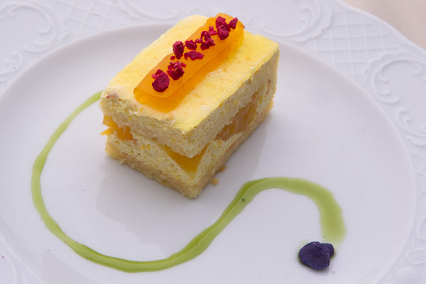 A díszvacsorák desszertjei minden alkalommal bizonyítják a cukrászok ambícióit. A jégborhoz Fehér csokoládés Sacher sütemény készült. A sütemény alapja fehér csokoládés Sacher tortalap. Erre egy sáfrányos, tejszínhabbal lazított sárgabarackkrém (mousse) került, majd a krémre agar-agarral sűrített, felfőzött sárgabarack lé, amelybe mozaikos elrendezéssel gyümölcs darabkák kerültek. Ezt egy újabb tésztaréteg borította, amelyet tejszínes krém fedett, s amire végül sárgabarack zselét tett a cukrász liofilizált eperdarabkákkal. S, hogy mindez ne legyen elég, a sütemény mellett a tányért ízletes citromfüves bazsalikom sziruppal díszítette. A desszert és a bor szépen illettek egymáshoz. (A vacsorát jegyzik: Jordán Piroska és Uti Attila szakácsok, valamint Zányi Tímea cukrász)