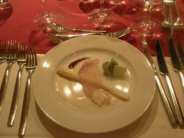 A szasimi (sashimi) a vékony szeletre szelt nyers halból készített japán ételek összefoglaló neve. Lehet előétel is, mint ezen a borvacsorán, ám főételként is előfordul. A spárgának éppen szezonja van. A sashimi igen sokféle mártással, kiegészítővel gazdagodhat, s már ez is alkalmassá teszi a spárgával való kombinálásra, ahogy a nyers hal és a spárga magas glutaminsav koncentrációja is.