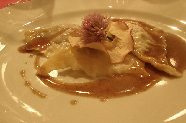 - Az étel: Kacsahússal töltött derelye mézes kacsa demi-glace, alma chipsz