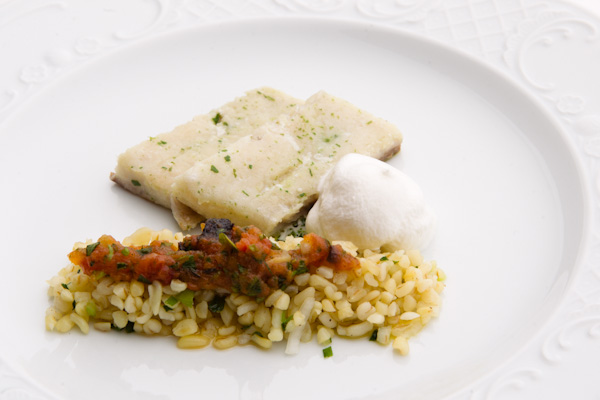 A furminthoz Tiszai harcsaérme paradicsomos búzatöret salátával komponálódott. A friss harcsát fehérborral, petrezselyemmel, snidlinggel 80°C hőmérsékleten tíz percig készítették. A búzatöret (bulgur) ősi alapanyag, amelyet szőlőmag olajon pirított hagymába kevertek, felöntötték vízzel, sózták és rövid időn belül készre főztek. A tányéron elrendezett búzatöretre paradicsomragu került, amelyhez a hámozott, kimagozott paradicsomot 80°C hőmérsékleten 4 órán át szárították. Az így készült paradicsomból sóval, citromlével, cukorral, kakukkfűvel, fokhagymával készítették a „ragut”, s rétegezték a búzatöretre, amivel már el is készült a paradicsomos búzatöret saláta. Harmadik fő elemként édeskömény hab is készült az előételhez.