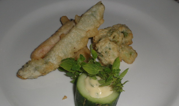 A zöldségekkel kevéssé próbálkoznak a bor-étel párosításoknál, pedig ezek a tempurába bújtatott zöldségek is megmutatták, hogy érdemes, legalább a bevezetésben megfontolni a felléptetésüket. nekem tetszettek, s a meleg estékre is gondolva, igazán szerencsés választás az ilyen étel. Az uborkába vájt „mártogató tartó” különösen ötletes.