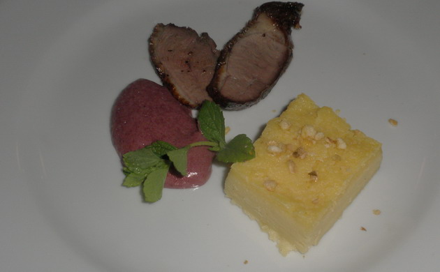 Gyengéden füstölt kacsamell szeletek kukorica máléval és szeder sabayonnal (Biarritz Étterem, Budapest)