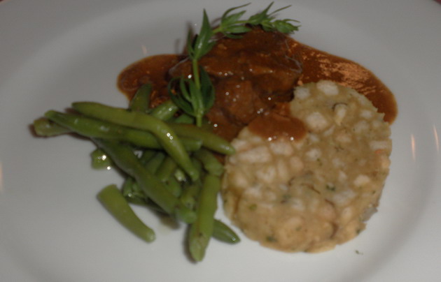 Pinot noirban confitált báránycomb pirított vargányagombás szalvéta gombóccal, vajas angol babbal (Biarritz étterem, Budapest)