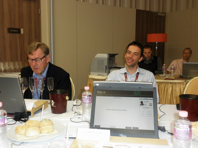 A VINAGORA Nemzetözi Borcerseny zsűrije a CHAMPION választás előtt (A képen balról Dr.Kosárka József, vele szemben Elisabeth Gabay)