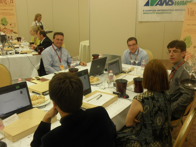 A zsűri a szünetben (Vinagora Nemzetközi Borverseny, 2011, Pécs), Szemben Tóth Adrienn, mellette Főrhénci Horváth Gyula, tőle balra Roberto Zironi. Mögöttük Dr.Zilai Zoltán, Dr.Kerényi Zoltán és Dr.Kállay Miklós