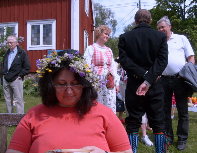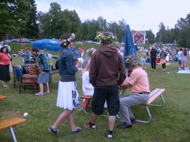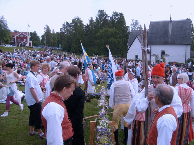 heringekkel, a friss eper tömény tejszínhabbal és az erdei bogyókból párolt snapsz. Délután, zuhogó esőben, ernyők alatt, virágos ruhába öltözött hölgyek és virágkoszorús nők, gyerekek és férfiak karéjában együtt ünnepeltünk Alnö sziget öregtemploma (1250-) rétjén a kereszt alakú díszes “midsommarstång” (májusfa) ünnepélyes fölállítását, ahol a kereszt forma az élet-halál-föltámadás fölkiáltó jele, míg virágdíszei a megújuló élet, az életöröm és a gyönyörű természet jegyei.