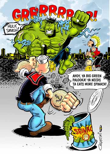 Popeye alakja képregény formájában 1929 januárjában jelent meg először, majd nem sokkal később, 1933-ban készült belőle azt első fekete-fehér rajzfilm. Generációk sorát szórakoztatta szerte a világon és a mai napig a televíziók műsorán van. Városi legendaként él, hogy a spenót Popeye-re ható mágikus erejébe vetett hitet egy hibás számítás táplálta. A történet szerint egy 19. századi német tudós a spenót vastartalmának értékében tévedésből eggyel odébb helyezte a tizedesvesszőt, amivel a növény vastartalma nyomban a valóságos tízszerese lett. A hibára csak az 1930-as években jöttek rá. Mindez azonban mítosz, és már a múlt század harmincas éveinek rajzfilmkészítői sem gondolták, hogy Popeye a vastól lesz erős, ahogy azt a gyermekeiket spenótevésre bíztató szülők még ma is nap, mint nap állítják. A spenót átlagosan alig 2,7mg/100g rosszul felszívódó vasat tartalmaz, vitamintartalma (A, C, folsav) azonban már számottevő.