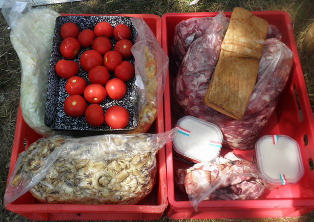 A húsok közül először a sertéslábat és a csontokat, ebben az esetben a szürkemarha kisebb darabokra fűrészelt húsos csontjait helyeztem a katlanba, és a tartalmát többször alaposan átforgattam. Ezután került a készülő ételhez a többi hús. A húst állandó keveréssel pörköltem, s technikai okokból, hogy le ne égjen, kevés víz is került alá. (Ezen a ponton eredetileg Tokaji furmint is tervezve volt, azonban nem érkezett meg, így az elmaradt.)