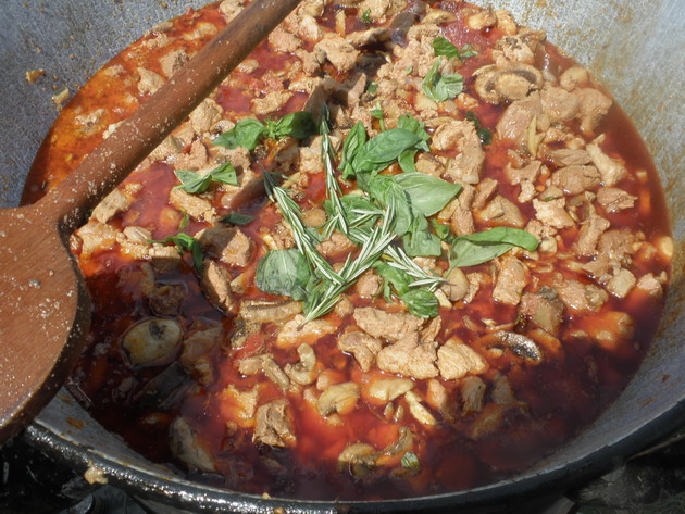 Amikor a hús már fehéredett, a katlanba került a karikára vágott paprika és a levet eresztő, szép, érett paradicsom. A főzés így folytatódott tovább, majd kevés őrölt fekete bors és kömény, valamint só került az ételbe, némi rozmaringgal, zsályával, bazsalikommal és karikára vágott hegyes zöldpaprikával. (A fűszerezés java az ételkészítés végére esett.) Amikor a hús már félig megpuhult, hozzáadtam a gombát is, majd amikor már majdnem puha volt, sóztam, ízlés szerint köménymagot, őrölt fekete borsot és bőven rozmaringot, zsályát és bazsalikomot adtam hozzá, (Akinek kedve van kakukkfüvet is adhat az ételhez, csak jó lesz tőle.) Az ételt kenyérrel fogyasztottuk, de bármi, ami a pörkölthöz jó, szóba kerülhetett volna.