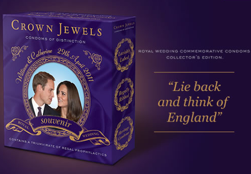 Azért a briteknek mégiscsak van humoruk, és úgy látszik, hogy a demokráciával is elég jól állnak. A „Crown Jewels” (koronaékszerek) óvszer legalábbis erre utalhat a: „Királyi esküvői emlékóvszer gyűjtők számára.” Az óvszer szlogenje is megfelelően brit és hazafias: „Dőlj hátra és gondolj Angliára”