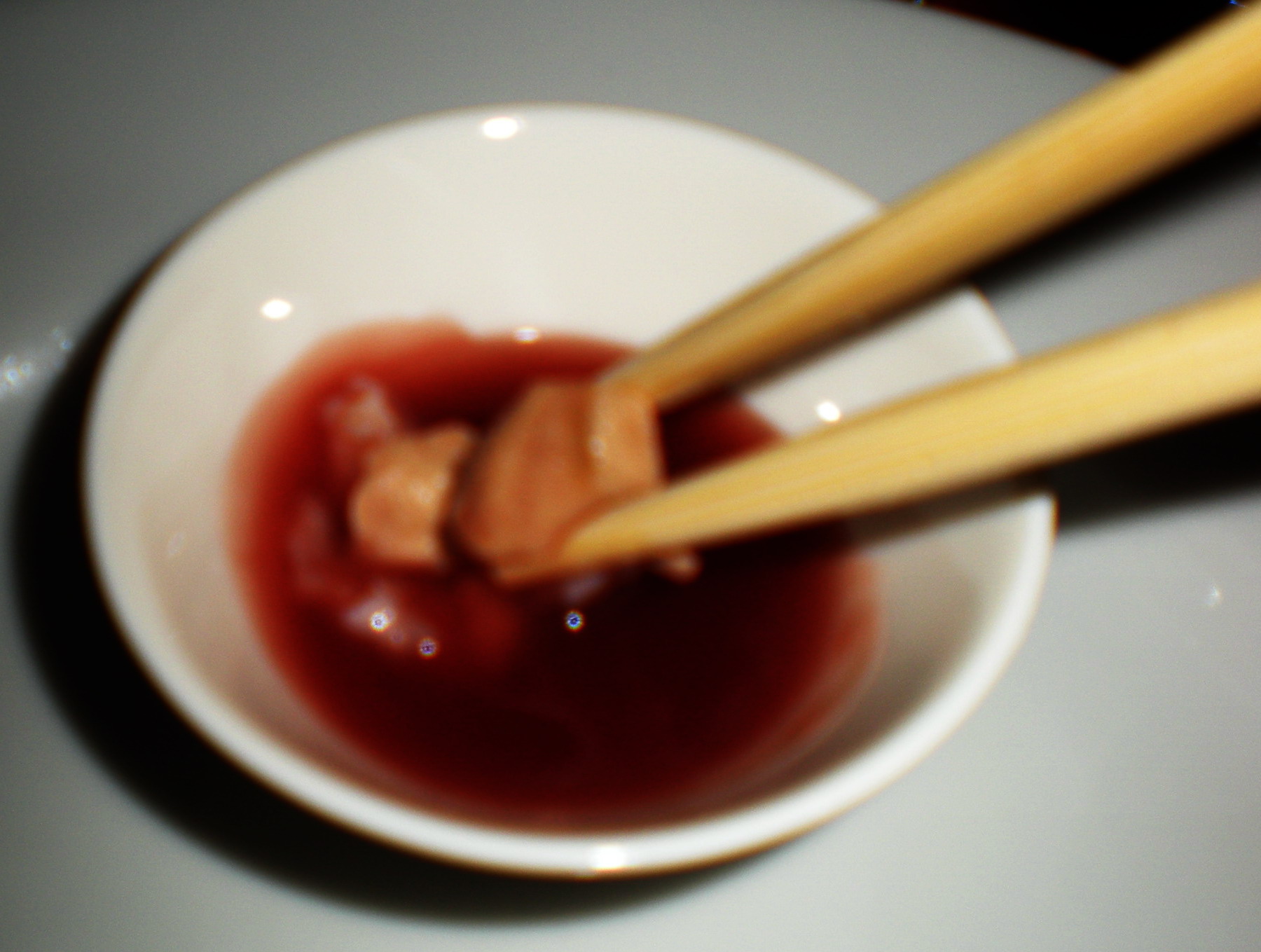 Nos, a gránátalma árnyalatú szín megihlette a séfet is, így aztán a hungarikumnak tekintett kadarkához szokatlan, meghökkentő és szürreális komponensként egy kézzel formált sushi fajta, a nigirizushi komponálódott, ráadásul gránátalma mártogatóval. Mindehhez pálcika is járt. Tetszett az ötlet. Bátor volt, közhelyeinken túlmutató és fantáziadús.