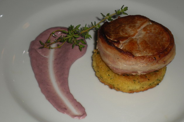 A hús sertésszűzből metszett mignon. Elsőre száraznak tűnő kölesfasírttal, amely azonban mégis csak jó lehetett, mert a konyhában kértem még a séftől, olyannyira tetszett. A vaníliás fekete szeder a borral való összekacsintás szándékával készült. A hús jól volt megsütve és a textúrák ellenpontjaként a jó ízléssel fűszerezett köles is tetszett.