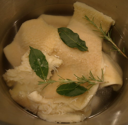 A PACAL már volt szereplője az egyik írásnak. Csülkös pacal címmel írtam egy igazán jól sikerült ételről. A pacal csülökkel is, disznólábbal is kiváló, ám a pacalnak most egy másabb, egy disznófejjel készült változatáról esik szó. Az étel továbbra is egyszerű, ámbár az elkészítéséhez szánhatunk rá időt bőven. A pacalt a képen látható módon vízben, babérlevéllel, rozmaringgal főztem egy órán át, csak ezt követően vágtam fel. Közben feldaraboltam a disznófejet is: a fület keskenyre, hosszúra, julienne-re.