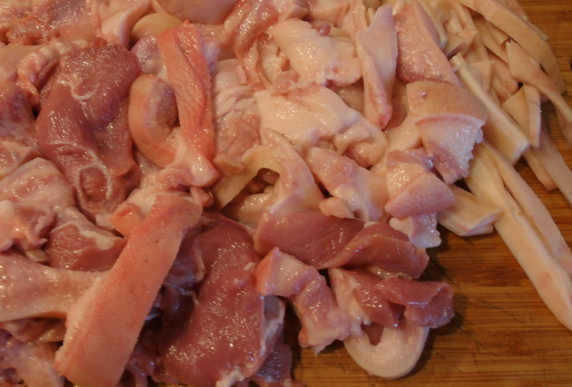 A fej több részét, a pofát, a tokaszalonnát, s más kicsontozott részeit a pacalszeletek méretéhez hasonlóra szabtam.