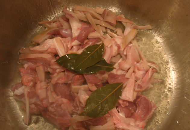 Amíg a pacal egy másik lábosban babérlevelekkel, rozmaringgal ízesítve főtt. A húst forró libazsírban forgattam meg, és sütöttem.