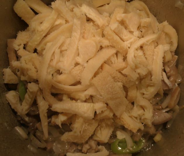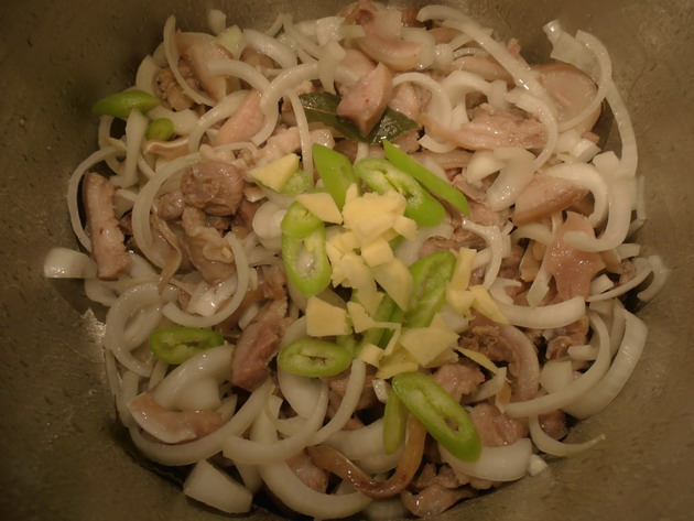 Szálasra vágott vöröshagymát, fokhagymát, frissen tisztított, aprított gyömbért és zöldpaprikát adtam a húshoz, majd továbbra is fedő nélkül folytattam a sütést/párolást.
