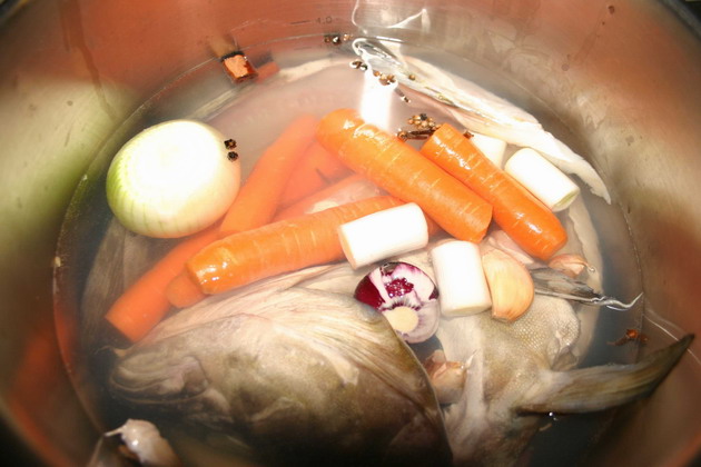 A halat beletekertem egy nagy edénybe, és készítettem belőle egy jó kis alaplét. Mennyiségeket azért sem írok, mert nem tudom, a másik ok, hogy ekkora hal otthon szinte nem is beszerezhető. A hal utolsó úszását hideg vízben kezdte meg, amely ellepte. Az alapléhez a következőket használtam: