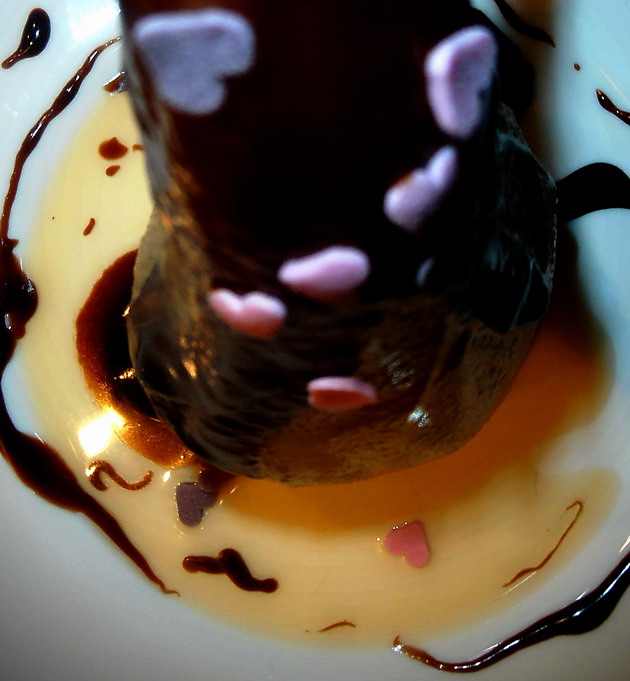 A körtét kivesszük a fűszeres vízből, hűlni hagyjuk, majd olvasztott csokoládét öntünk rá. Díszíthetjük kis cukorszívekkel is és önthetünk alá likőrt, esetleg flambírozhatjuk is. persze a gyertyákról se feledkezzünk meg, s flambírozásnál a inkább csak diszkrét legyen a fény, hogy a kék lángok is szebben mutassanak. Szép Valentin napot mindenkinek, aki tartja!