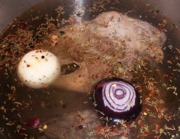 A fejeket hideg vízben áztattam, többször is vizet cserélve, alaposan megmostam, majd vízbe tettem, és a forrásba jött vizet leöntöttem, újra vizet öntöttem a lábosba, és a birkafejet fűszerekkel (bors, szegfűbors, római kömény, babérlevél, chili, lepkeszegmag, stb.) hagymával, fokhagymával, gyömbérrel, sóval ízesítve, feltettem főni.