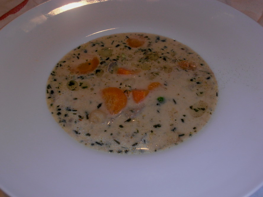 A lehűtött léről a megdermedt zsírt leszedtem, a levet leszűrtem és leveles zellergumóval, karikára vágott sárgarépával és petrezselyemgyökérrel zöldségeztem. Egy érett, hámozott citrom félbevágva került a lábosba. A készülő leveshez (egytálételhez) tisztított felvágott burgonyát (ízlés szerint) kevertem és a fejhúst, nyelvet is hozzáadtam, majd addig főztem, amíg a zöldség, burgonya, puha nem lett. Ekkor tejfölt kevertem hozzá és tárkonylevéllel, finomra vágott kaporral, petrezselyemzöldjével, és ugyancsak apróra vágott zöldpaprikával ízesítettem. Sóztam, borsoztam, szerecsendiót reszeltem rá, és kanálnyi jó minőségű extra szűz olíva olajat is adtam a leveshez. Forrón tálaltam.