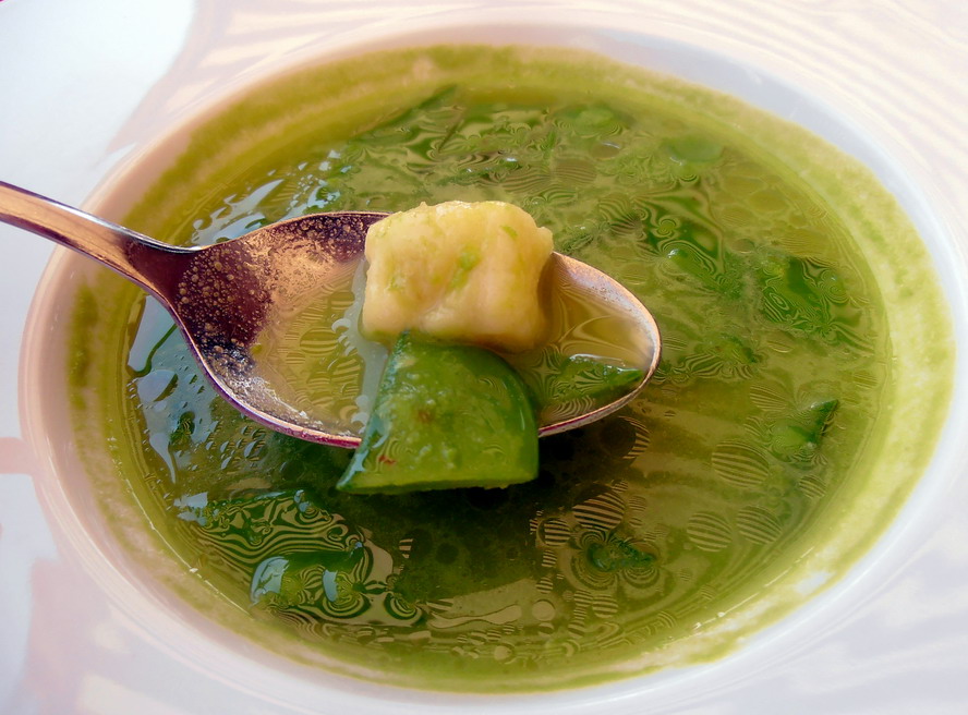 A képen a zöldborsó „esszencia” cukorborsóval és krumplinudlival gazdagítva készült. A levest a séf, Jahni László (Kistücsök, balatonszemes) mentaolajjal is ízesítette. Üde, friss ízű, nagyszerű leves.