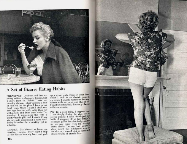 MARILYN MONROE (1926-1962), az 50 esztendővel ezelőtt elhunyt legenda diétája igen csak elütött napjaink hollywoodi sztárjainak táplálkozásától. Persze, Marilyn sok más tekintetben is kilógott a sorból, ahogy a táplálkozásából is látványosan hiányoztak a megfontoltság szembetűnő jelei. Nem volt léböjt kúra, speciális, az éppen divatosnak megfelelő étrend. Egy, a Pageant magazin 1952 szeptemberi számában megjelent interjú szerint, Marilyn Monroe számos, bizarrnak nevezett étkezési szokással bírt.