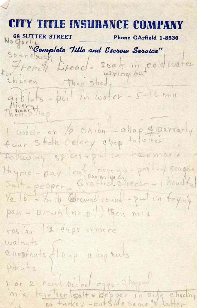 1/2 lb. – 1/4 lb. (220-110 g) darált marhafartő – tegyük serpenyőbe – pirítsuk (olaj nélkül) aztán keverjünk hozz 1 1/2 csészényi, vagy több mazsolát, egy-egy csésze aprított diót, gesztenyét, fenyőmagot, 1, vagy 2 aprított főtt tojást. Keverjük össze. A csirkét, vagy pulykát sózzuk, borsozzuk meg belül és kívülről vajazzuk be [majd töltsük bele a tölteléket].