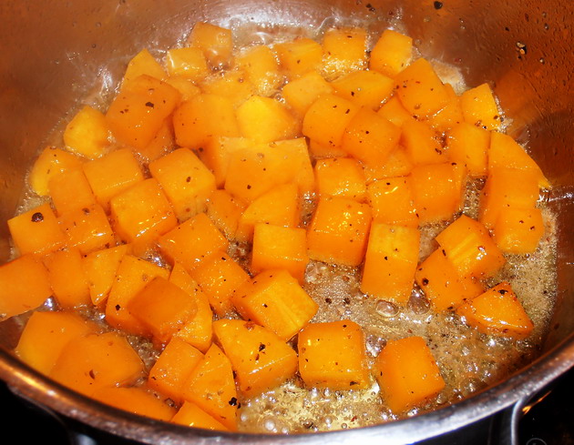 Elkészítése: Lábosban, közepes hőmérsékleten olvasszuk fel a vajat, adjuk hozzá a sütőtököt, szórjuk meg a kevés cukorral, sózzuk, borsozzuk ízlés szerint. Pároljuk 5 percig, majd fedjük le és 10 percig hagyjuk puhulni. Ha elkészült, vegyük ki a lábosból a sütőtököt és tegyük félre.