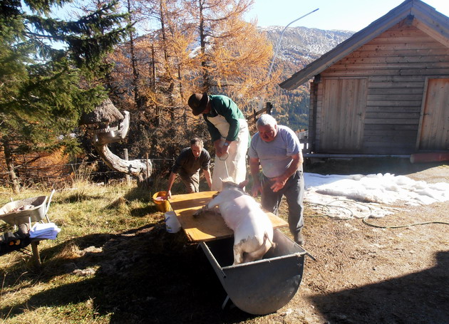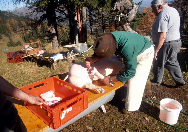Ittam a Stiegl sört és élveztem Katschberg Höhe felett a szikrázó alpesi napsütést, amikor a levágott disznót elhúzták a Hütte mögé. Indultam nyomban, hogy megörökítsem, miképpen is vágják a disznót errefelé, s az alig 3/4 órás művelet során többször is elcsodálkoztam, mert egyáltalán nem arra számítottam, amit végül láttam.