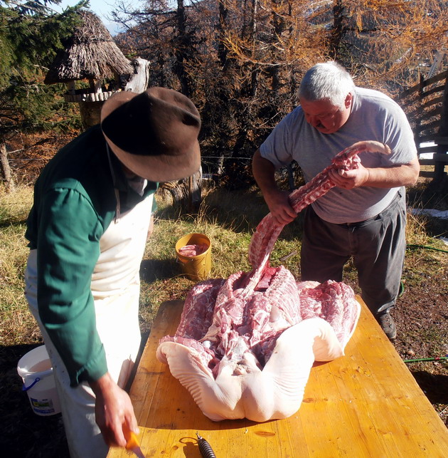 A disznóvágás során, s után (akkor már sör és Obstler mellett) elbeszélgetem a böllérrel, aki váltig állította, hogy ez a fajta bontási mód (=orjára bontás) kizárólag Ausztriának ezen a részén, a Katschberg környékén ismert, s ma már csak a parasztok vágnak így, a „Metzger”, vagyis a mészáros nem.