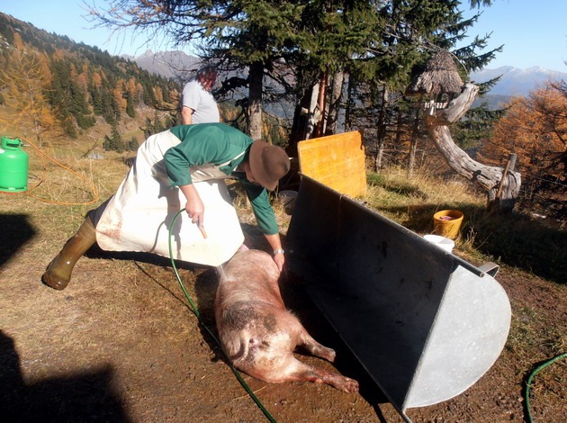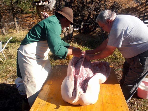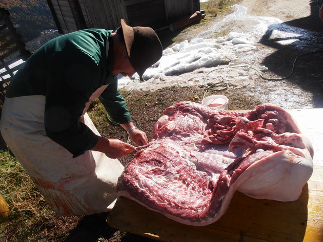 A disznóvágás során, s után (akkor már sör és Obstler mellett) elbeszélgetem a böllérrel, aki váltig állította, hogy ez a fajta bontási mód (=orjára bontás) kizárólag Ausztriának ezen a részén, a Katschberg környékén ismert, s ma már csak a parasztok vágnak így, a „Metzger”, vagyis a mészáros nem.
