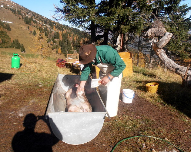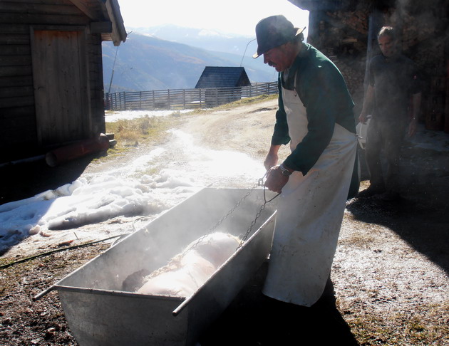 Ittam a Stiegl sört és élveztem Katschberg Höhe felett a szikrázó alpesi napsütést, amikor a levágott disznót elhúzták a Hütte mögé. Indultam nyomban, hogy megörökítsem, miképpen is vágják a disznót errefelé, s az alig 3/4 órás művelet során többször is elcsodálkoztam, mert egyáltalán nem arra számítottam, amit végül láttam.