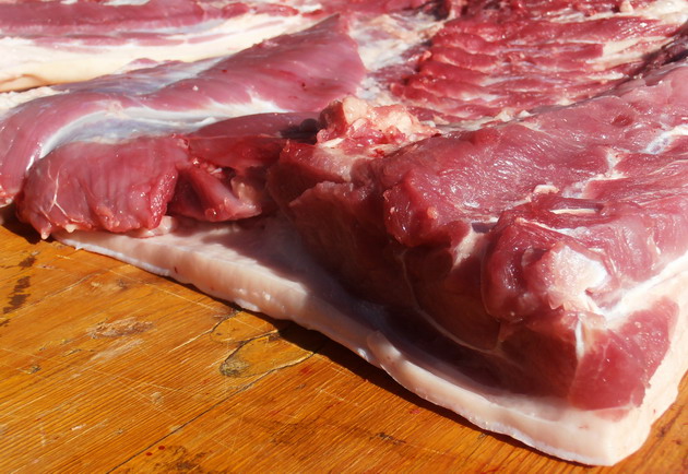 Hasra fektetés előtt a disznó lábait az ízületnél lemetszik, fejét levágják, nyelvét , tokaszalonnáját külön teszik