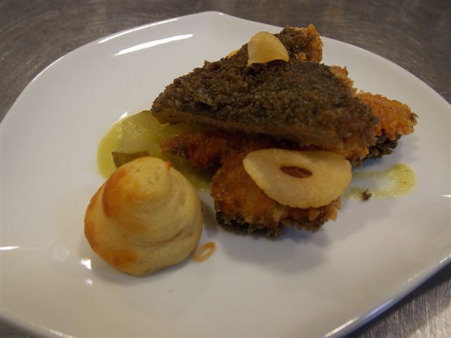 Füstölt harcsafilé, kukorica textúrákkal (Kukorica nudli cornflakes bundában, pattogatott kukorica, krémes polenta)