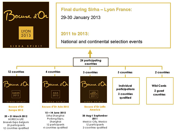 BOCUSE d’OR – A nagyvilágból mindösszesen 24 ország lesz 2013. január 29-30-án Lyonban, a Bocuse d’Or szakácsverseny döntőjén. A huszonnégyből 12 ország versenyzője, köztük Széll Tamás, érkezik Európából, 4 Ázsiából, 3 Amerikából. A döntőben lesz még még 3 ország azok közül, akik szervezési okokból kontinens viadalon nem vehettek részt, plusz 2 másik olyan ország, akit a rendezők
