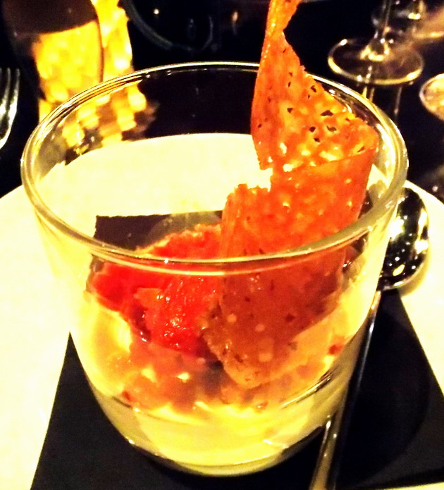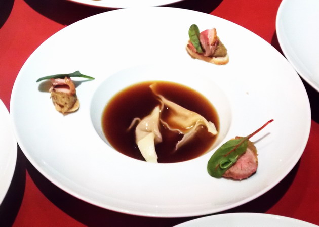 - A levesről az egyik vendég Osamanak hangosan megjegyezte, hogy ez volt „élete legjobb levese„. Valóban intenzív, kerek, telt volt; összetett vargánya ízzel, remek állagú, Osama Kutaini által ezúttal „Agnolotti”-nak becézett, édeskés sütőtök töltelékkel töltött raviolival. Az öt esztendőn át palackban érlelt, 45% Chardonnay és 55% Pinot noir borból készített mélysárga, gyümölcsös „Les Folies de la Marquetterie” Brut nagyszerűen harmonizált a levessel, ami pedig külön felhívja a figyelmet a levesek pezsgők párosításában rejlő kivételes lehetőségekre.