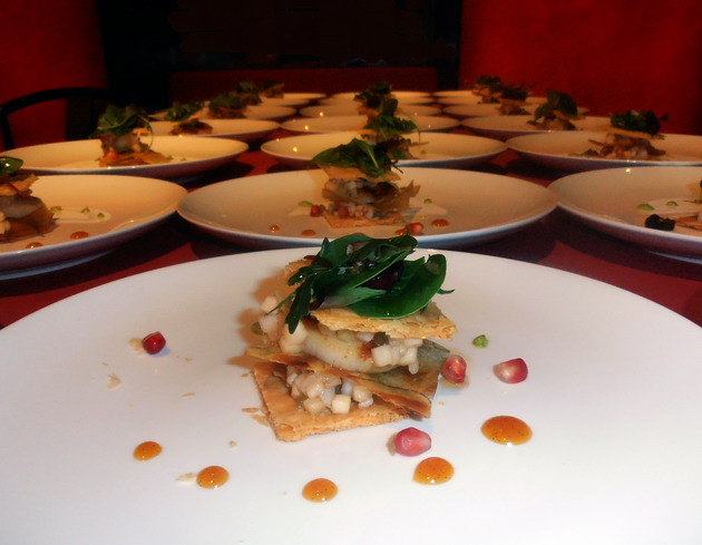 - Étel: Homár és Szent Jakab kagyló mille feuille egzotikus gyümölcssalátával, vanília esszenciával