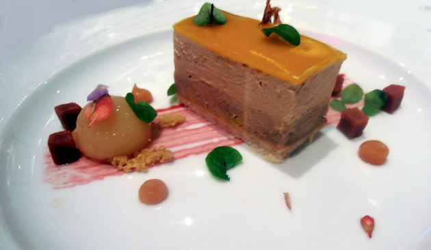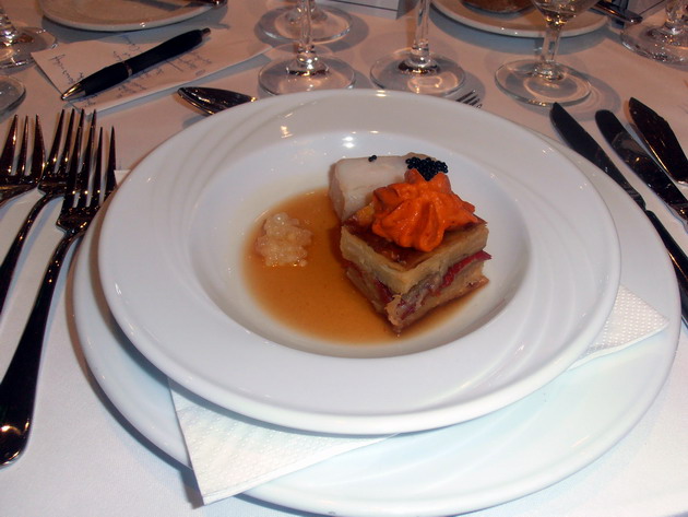 Ránézésre ugyan zserbóra emlékeztet, de csak annyira desszert, amennyire zserbó. A hangulatos fogás négy részből áll: az omlós tésztán kacsamáj „rilette”, amire kacsamáj „mousse” rétegződik, arra pedig zselé. Körülötte mangó, birs és körte hivatott a 6 puttonyos aszú meghatározónak gondolt zamataival kapcsolatot teremteni. A magam részéről kedvelem az aszú és étel kombinációkat, s továbbra is kiaknázatlannak látom ezt a területet. Itt és most szerencsére újra igazolódott, hogy érdemes az aszúkkal kísérletezni.