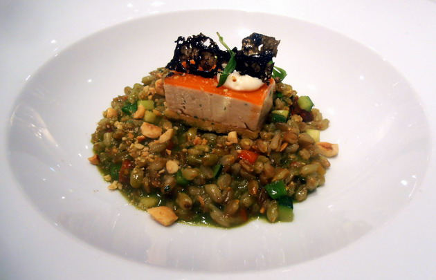 Turbolyás vaj, meleg tönkölybúza „rizottó”, langyos velőtorta, cukorborsó, kamilla, koriander, mogyoró, a színek, formák, hőmérsékletek és textúrák remek játéka, egyfajta kása, sok ízzel és élménnyel, fekete tintahal tinta-croquant. Kiválóan kivitelezett, kiváló étel, melyet a furminthoz is illőnek éreztem.