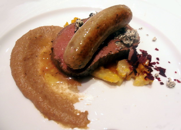 A húzott csicsókapüré diós ízesítést kapott. A sous-vide hátszín 68°C hőmérsékleten öt órán át készült, furmint redukcióval is ízesített, rajta maltodextrinnel készített olíva olaj por, hawaii fekete lávasóval keverve, tapanade ízvilággal, körülötte, s alatta zellerből, karalábéból, feketegyökérből, sütőtökből összeállított, ízletes saláta. Intenzív, és karakteres só íz, omlós hús, kellemes csicsóka, harmonikus kolbász, halvány vargánya zamattal, remek állaggal. kellemes harmóniák a borral.