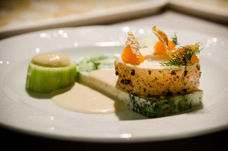 - Az előétel: pácolt és „feketített” tőkehal, törpemaréna kaviár és ropogós tőkehal bőr, karfiol-brokkoli terrine, mousseline szósz északi meleg zöldségekkel, citromos uborka és osztriga emulzió, fehérboros mártással.