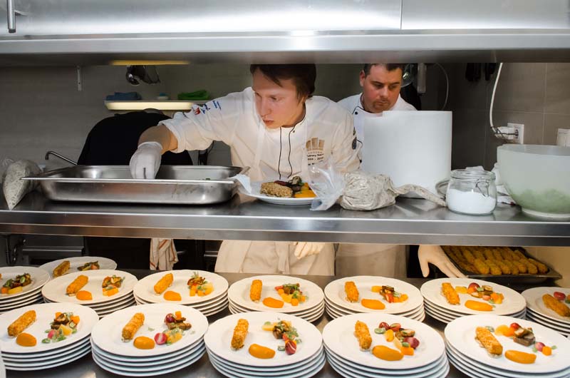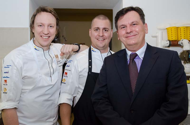 Benéztünk a konyhába is, ahol már készültek a vacsora fogásai, melyek már csak ezért sem voltak akármilyenek, mert Fredrik és Viktor éppen ezekkel a Budapesten is bemutatott fogásokkal nyertek 2012-ben Erfurtban aranyérmet.