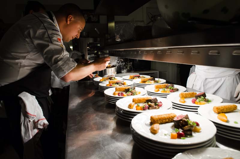 - A főétel: fűszeres kérgű gímszarvas gerinc és nyak, sajtos, vargányagombás duxelles ízesítésű ropogós burgonya, szezonális zöldségek és sütőtök püré, ecet szósz.