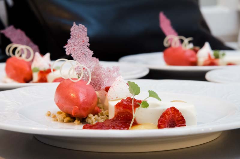 - A desszert: Tejföl puding, málna sorbet, tavaszi málna, joghurt habcsók, málna pálinkával ízesített Madeleine