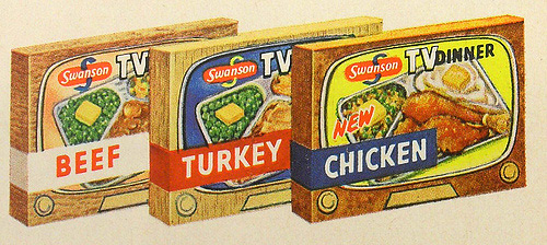 előrecsomagolt, többnyire egyadagnyi fagyasztott étel, amely egy egyszerű étkezés valamennyi elemét tartalmazza, emellett nem igényel bonyolult készítési műveleteket. A mélyített alumínium tálcán csomagolt ételeket sütőben melegítették fel. Az 1953-ban bevezetett „TV dinner” márkanévként indult, ám a népszerűség jeleként, a köznyelvben hamarosan már minden hasonló ételt így neveztek.