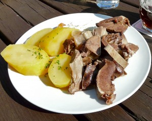 A szalonnazsírban pirított, hagymás főtt krumpli tojásrántottával, zöldbabbal, laktató étel, akárcsak a véres hurka (Grieweworscht) és a téli disznóvágások közben is fogyasztott vérrel készülő egyéb ételek, „pörköltek”. A véres ételek mindenütt elterjedtek a mindent hasznosító, tápláló ételeket kereső és előnyben részesítő paraszti portákon. Disznóvágáskor elterjedt a „Kesselfleisch” is, ami nem más, mint a sóval, borssal, fokhagymával, hagymával ízesített, üstben abált hurka-hozzávalók, a fejhús, máj, szív, vese, bőr, szalonna, húsnyesedék, elnevezése. A „Metzelsupp”, vagy „Worschtsuppe” a tartalmas, zsíros abaléből készülő leves. A „zöldszósz héjában főtt burgonyával” (Grüne Soße mit Pellkartoffeln), esetleg tojással dúsítva, szintén jellegzetes étel az óhazában. Nálunk a főtt burgonyához adott sóskaszósz idézi fel ezt az ételcsoportot, gyakran éppen tojással.