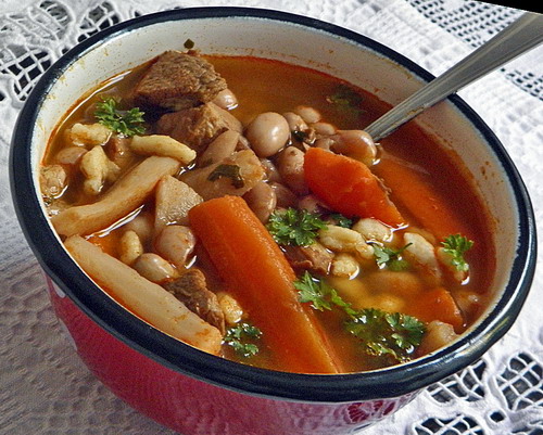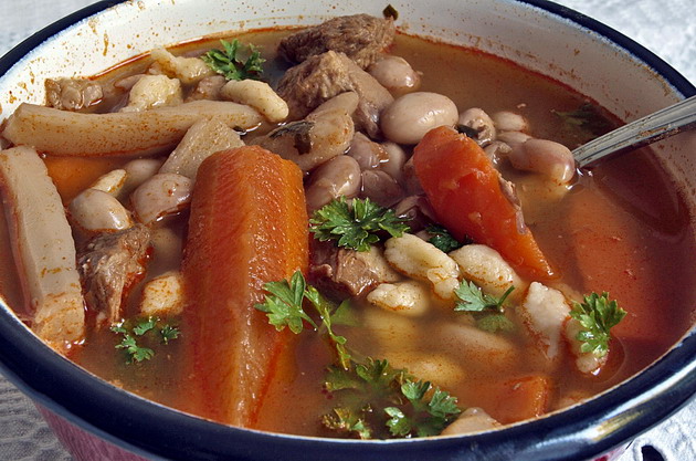 Eközben a babot és a zöldségeket megsóztam, hozzáadva az ízesítőket, szinte saját levükben pároltam félpuhára. Ekkor kevés borsot őröltem rá és összekevertem a pörkölttel felengedtem a szükséges vízzel és készre főztem. Az ízesítőket, a csontot és a bőrt kitettem a levesből. A vaj puhára főtt csülökbőrt többen örömmel fogadták – pirítós kenyéren újhagymával kínáltam előételként.”