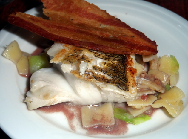 Fogasfilé káposztás tócsnival, ibolyás mustármártással